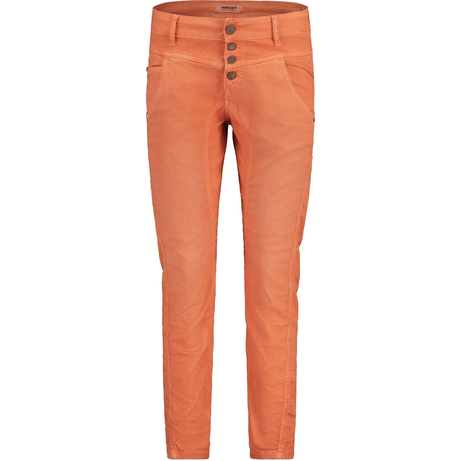 Gekleurde broek met omgeslagen zijnaad, twee steekzakken voor en een muntzakje, twee opgezette achterzakken, lage taille en slanke pijpen, opvallende knoopsluiting voor. Kleine Maloja-patch op de rechterachterzak.