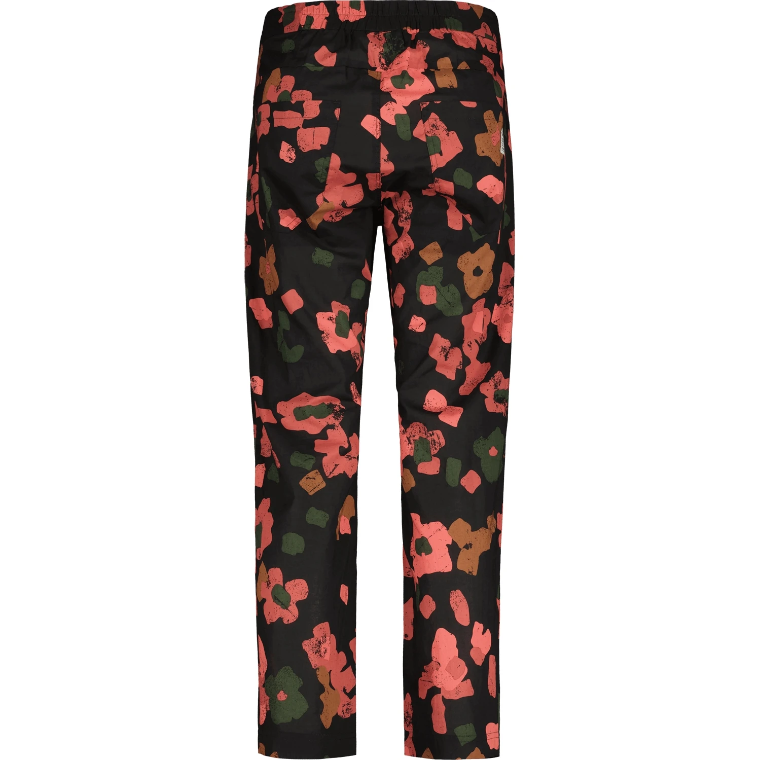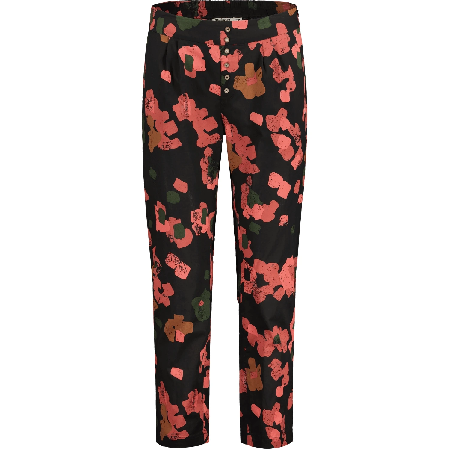 Coole zomerbroek van biologisch katoen met twee steekzakken, elastische tailleband en knoopsluiting. De all-over prints zijn geïnspireerd op bergvarens en alpenprimula’s.