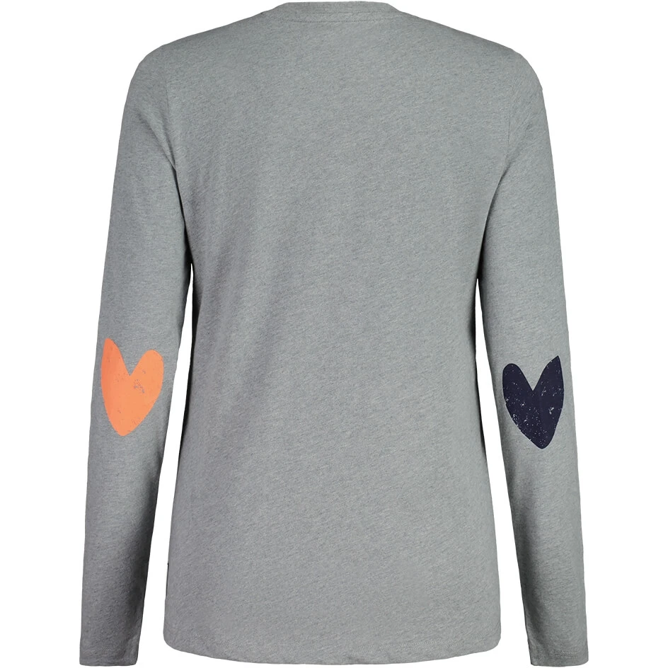 Losvallende longsleeve met overgesneden mouwen van eerlijk en biologisch geproduceerd katoen, online traceerbaar volgens bioRe standaard. Met grote retroprint op de borst, hartjesprint op de ellebogen.