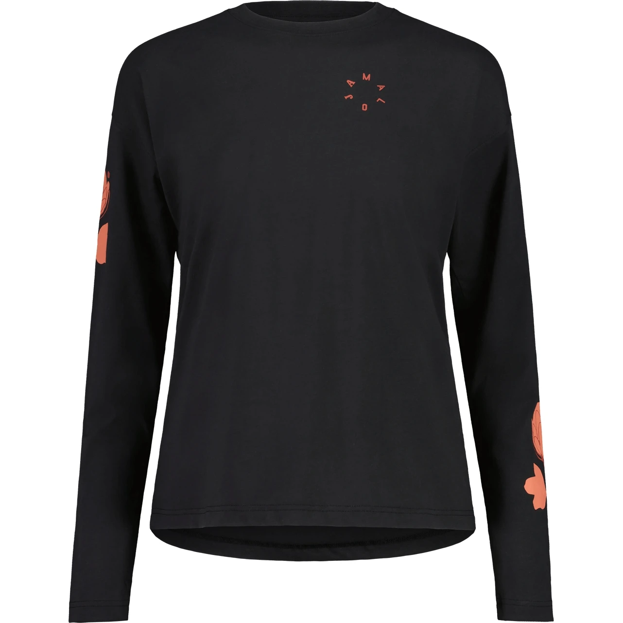Losvallende longsleeve met overgesneden mouwen van eerlijk en biologisch geproduceerd katoen, online traceerbaar volgens bioRe standaard. Asymmetrisch geplaatste alpenbloemmotieven op de mouwen.
