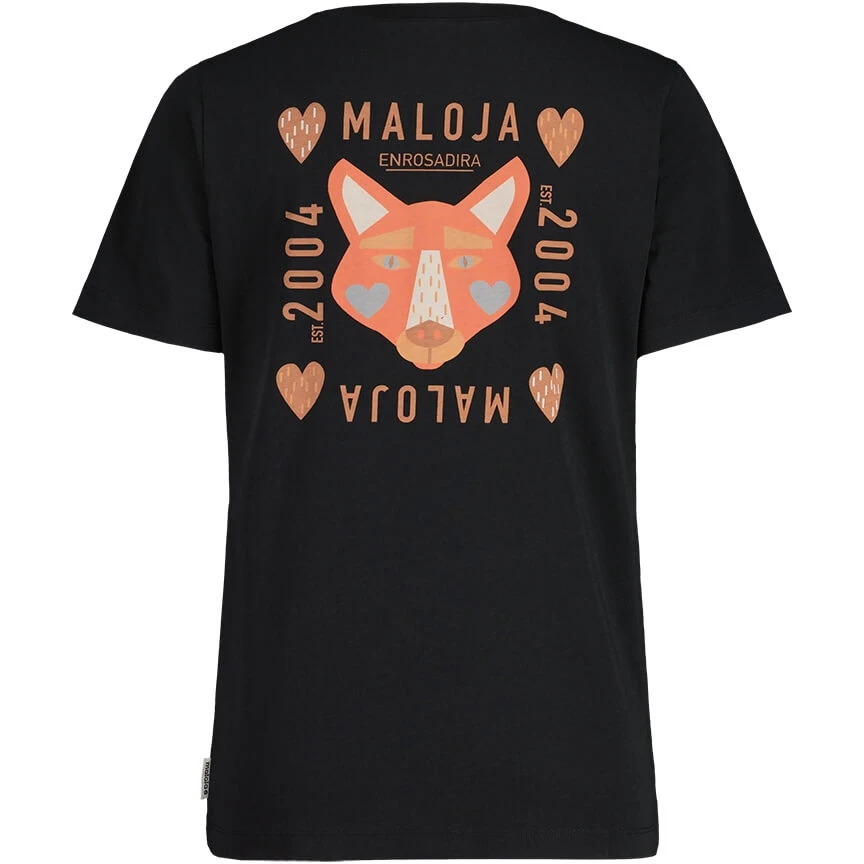 Basic T-shirt van biologisch katoen met grote vossenprint op de rug en Maloja-letters op de borst.