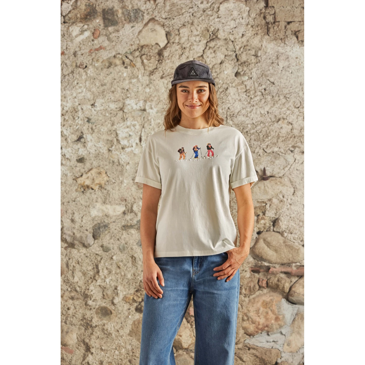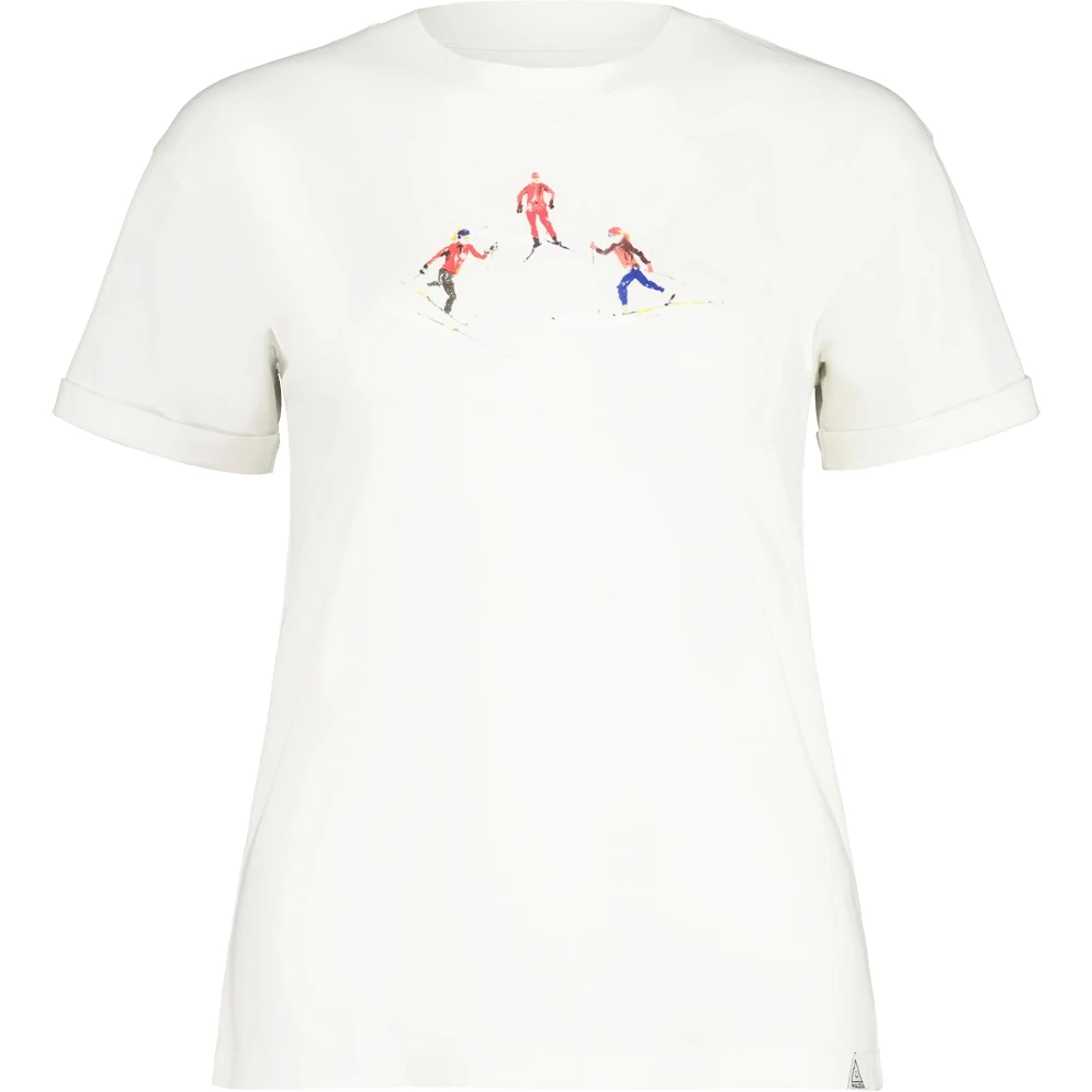 Basic T-shirt met opgerolde mouwen van biologisch katoen, versierd met drie handgetekende 3D-prints: skitouren, freeride of langlaufen.