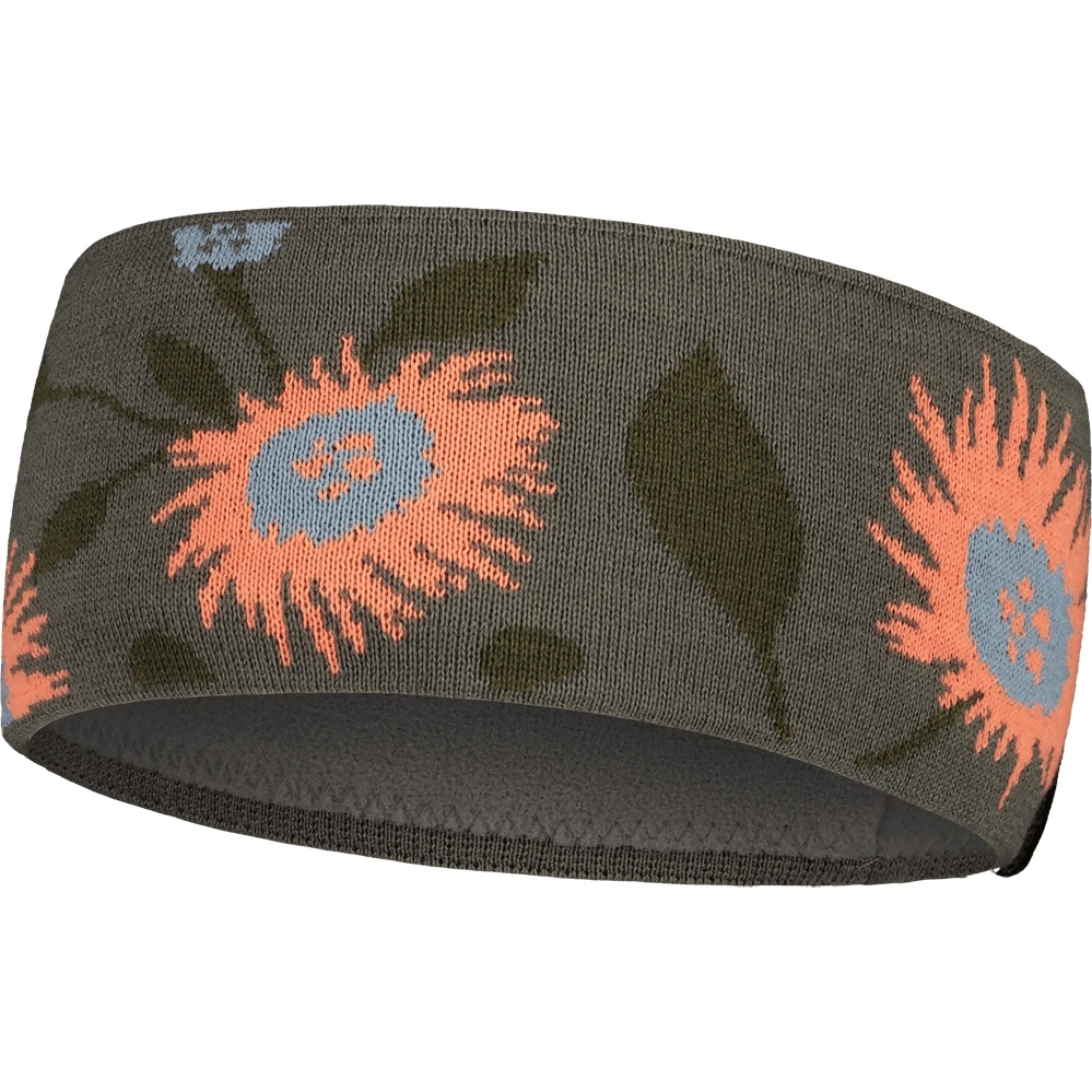 Warme, met fleece gevoerde hoofdband van wolmix met ingebreid bloemenpatroon. Verticaal Maloja etiket op de rand.