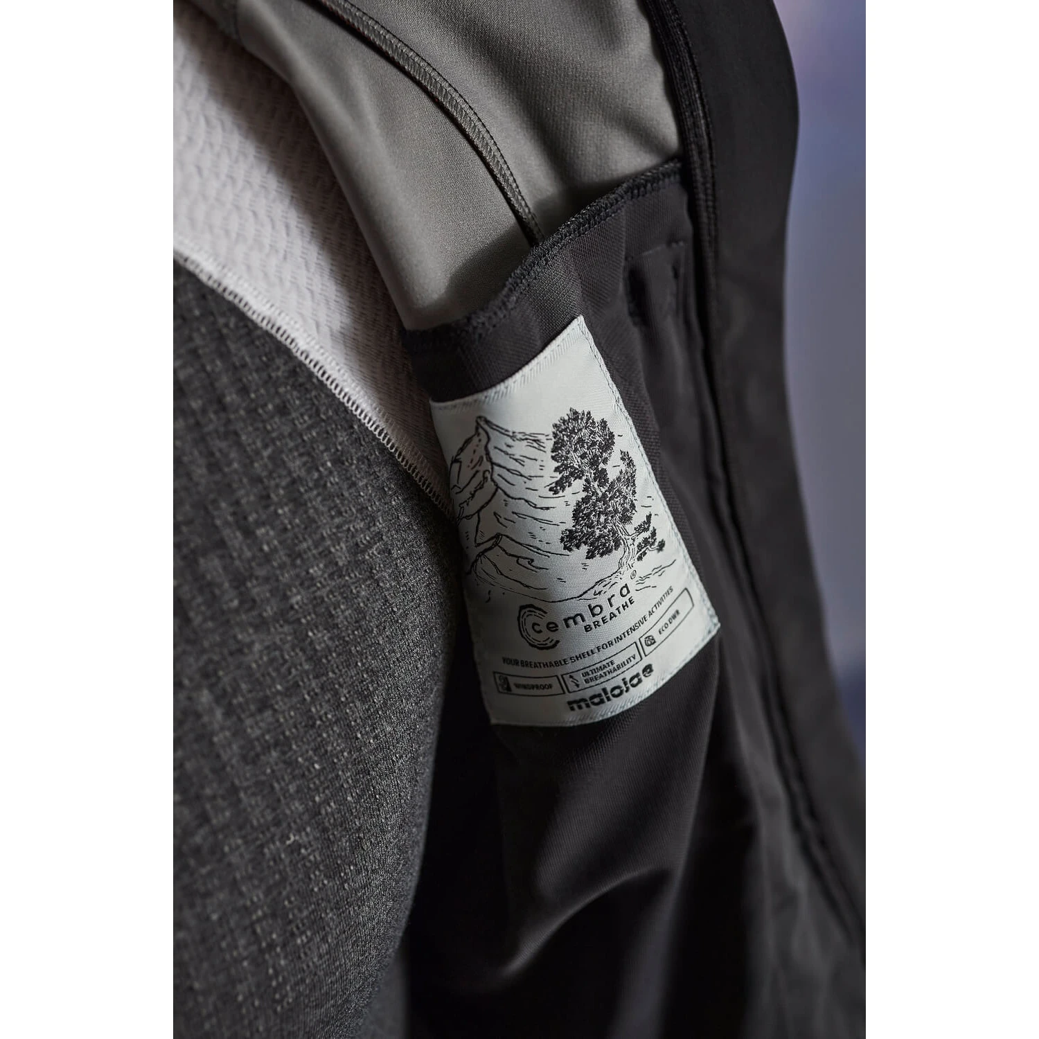 Deze hybride jas is ontwikkeld voor veeleisende skitochten. De hele voorkant is gemaakt van ons ademende, elastische en toch weerbestendige cembra® BREATHE-materiaal, de achterkant en mouwen van Thermal Stretch Eco voor maximaal ademend vermogen en onbeperkte bewegingsvrijheid. Een mond-neusbeschermer met ventilatiegaten is geïntegreerd in de nauwsluitende stormcapuchon, en een lasergesneden boom op de rug zorgt voor maximale ventilatie. Twee verborgen voorzakken met ritssluiting, reflecterende Maloja belettering met twee panelen op de bovenarmen en Enrosadira patch op de voorkant.